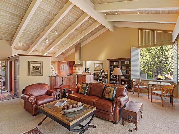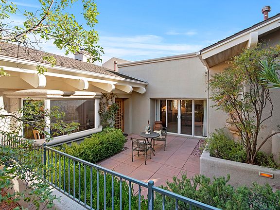 This home sets on the edge of the Nat'l Forest Service with trail access from your backyard! Enter through quaint courtyard. Kitchen has been updated nicely with granite countertops, Wolf stove, wood floors and the bay window has views of Coffee Pot rock. Beautiful wood ceilings with large picture windows provide an open, airy atmosphere. Living room has custom lighted cabinetry and a wood burning fireplace for a nice ambiance. The master suite has ample space with bay window and walk in closets. Dual vanities on granite countertops, walk-in shower and soaking tub complete the suite. Guest bedroom has a private courtyard entrance. Additionally there is an office/den with custom built-in cabinetry and sliders to patio. The extra large yard is fully fenced and landscaped. Gated community