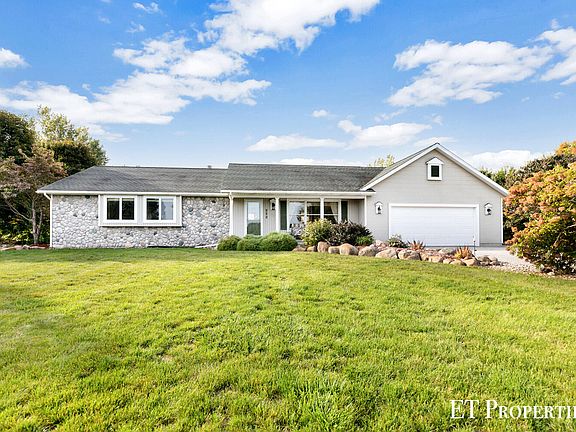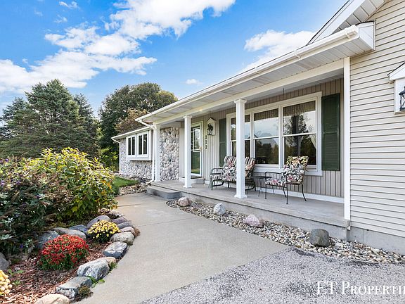 Welcome to your dream retreat in Kent City! This charming farmhouse-style ranch sits on 6 picturesque acres with a private pond stocked with bass and bluegill, perfect for peaceful afternoons outdoors. Inside, you'll find 3 bedrooms including a spacious primary suite with ensuite bath, main floor laundry, fresh paint, new carpet in the bedrooms, and updated fixtures. The vaulted living room features a cozy fieldstone wood-burning fireplace, while hardwood hickory floors flow through the kitchen, dining, family, and formal dining areas. Beautiful oak trim adds timeless character throughout. Enjoy slow mornings on the front porch, restful evenings on the expansive back deck, or relax in the attached Michigan room overlooking your land. Practical perks include an attached 2-stall garage plus an additional garage with kennel, along with updated utilities, well, and septic. A rare blend of rustic charm and modern comfort, ready to welcome you home.