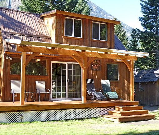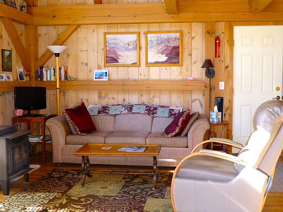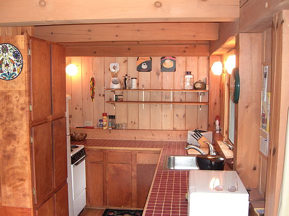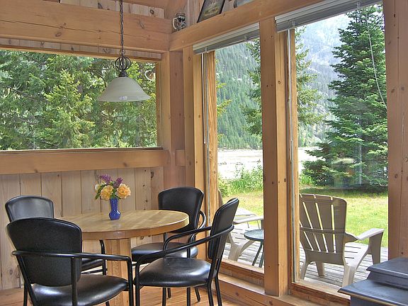 Craftsman, timber-framed cabin with concrete foundation and metal roof, good well, loft with queen bed and 2 twins, sleeping porch entry with enclosed bedroom with queen bed, bath with soaking tub and tiled shower, kitchen with dishwasher and tiled counter tops, ceiling fan, wood stove with viewing fire, electric heat, covered cedar deck, panoramic view of water and mountains from every window.