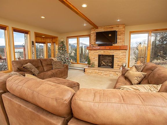 Luxury Mountain Home on 3 acres! Stunning mountain views from this 3bd + office/ 3.5 bath home with floor to ceiling windows on a quiet cul-de-sac. On county maintained roads & close to pavement. Open floor plan, high ceilings w/ beautiful dry stack gas fireplace, large custom kitchen w/ granite countertops, range hood & access to expansive wrap around deck. Large living room & Rec Room, steam shower & hot tub, oversized garage, fenced yard! Adjacent Open Space & only 30 minutes to Breckenridge!