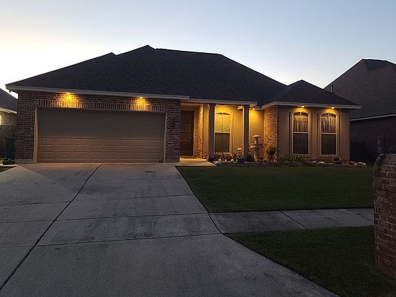 French Style Home located on premium homesite with LARGE Fenced in backyard, and a peaceful waterside view. This beautiful home features many custom design touches, an Open/Split floor plan, and an extended covered patio with brick columns and custom brick inlay. The spacious Kitchen features maple cabinets with expresso finish, granite countertops, copper kitchen sink, under cabinets lighting, gas range, tumbled marble backsplash, and slab granite countertops. The home also has custom surround sound pre-wiring in family, patio, Master Bedroom and Master Bath. Brick pavers in Kitchen, cafe' & utility. Large Master Bedroom with walk-in closet and suite bathroom. The home also has ADT alarm system accompanied by outside cameras. Backyard and patio are perfect for children to play while you can watch them from inside thru the multiple windows which give you a full view of your spacious backyard, and those gorgeous multi-colored South Louisiana Sunsets !!