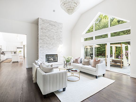 Hidden down a picturesque drive lined with majestic pines, you'll find a splendid custom-built home situated on a private 4-acre estate in the sought-after East Hampton area. This 6,500 (including lower level) square foot residence has recently undergone a comprehensive renovation, from the interior details to the mechanical systems, creating a luxurious oasis for your enjoyment. As you enter, you'll be greeted by a grand foyer with a vaulted living room, highlighted by a floor-to-ceiling stone fireplace and two stunning chandeliers. The heart of the home, the high-end custom kitchen, features a spacious island with seating, abundant cabinet storage, a stone fireplace with a reclaimed wood mantel, and is a chef's dream. Adjacent to the kitchen is a light-drenched sunroom, complete with a bar and wine refrigerator, and a set of French doors that open to the inviting pool and deck area. Throughout the residence, you'll find rich wood floors, an office with a full bath, and a first-floor Junior suite with a luxurious bathroom. The first-floor vaulted primary suite is not to be missed, with French doors that lead to the deck, a spa-like bath, and a custom-built walk-in closet. Upstairs, there are two additional en-suite guest rooms, along with an extra room that can be used as a gym, den, or office. The lush grounds provide a serene setting for resort-style living, with a heated pool and a wooden deck for swimming and soaking up the sun on warm summer days. There is room for a spacious rear yard, ideal for hosting barbecues and cocktail parties, offering plenty of room for al fresco dining. Additionally, there's an outdoor shower for your convenience after a day at the beach or a refreshing dip in the pool.