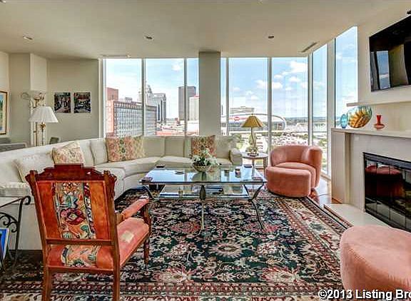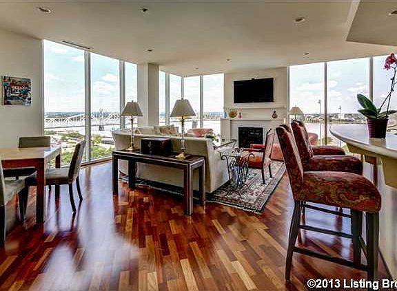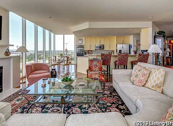 Gorgeous views and impeccable quality. This exceptional 2 bedroom 2 Bath condo is a corner unit located on the 9th floor of Waterfront Park Place with panoramic views overlooking the Ohio river and Great Lawn events, including Thunder Over Louisville with family and friends. The living room has a custom fireplace with secret built-in shelving. Custom cabinetry in kitchen includes expansive bar area, stainless steel gourmet appliances and ice maker and large walk-in pantry. A spacious dining area creates comfortable entertaining with balcony overlooking the Yum Center and roof top swimming pool. The condo foyer has double doors to the left through which you will find a wonderful office and a built-in library with private balcony. The master suite has seating area, two major walk-in closets. Double vanity master bath. Building amenities include a 24 hr. attended lobby, exclusive club room, terrace room with catering facilities, 24 hr. fitness club, and rooftop swimming pool. Two parking spaces (27 & 28) and large storage unit are located on the second level. Awesome storage spaces.