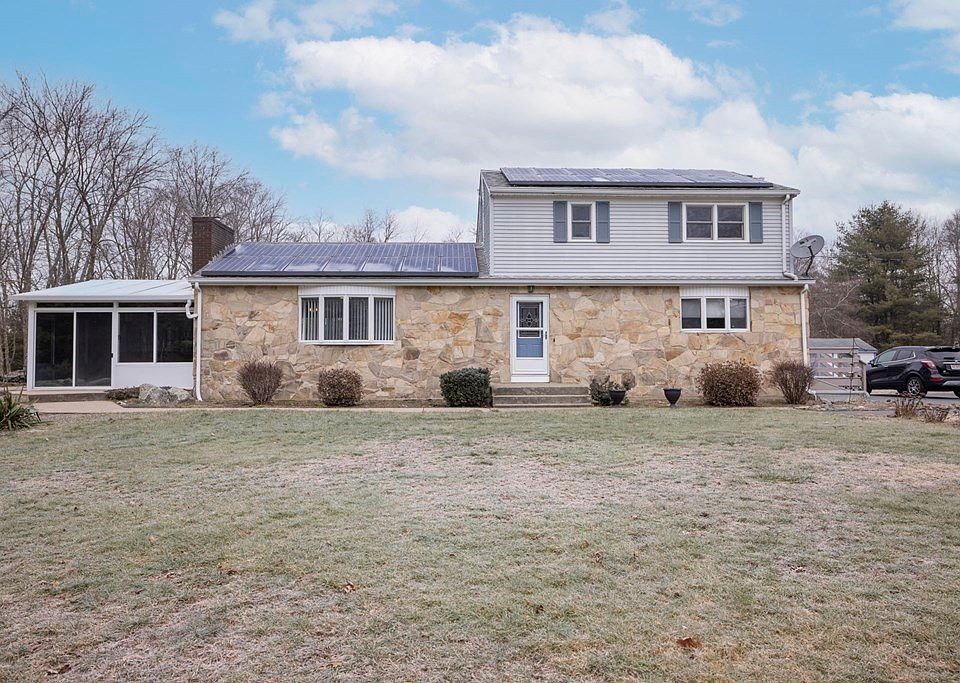 Over 3 acres of park-like acres set back off the street in beautiful Seekonk. First floor offers two bedrooms, second bedroom was converted into a den/laundry/mudroom but could be converted back to a bedroom. Upstairs offers two more generous sized bedrooms and a half bath. Upstairs carpeting is outdated but very clean. Solar panels installed in 2017; whole house is now electric heat with a thermostat in each room. Kitchen offers granite counter tops, all appliances to stay; Refrigerator and Range are BRAND NEW. Dishwasher is a Miele. Windows are three years young. Hardwood throughout the first floor. Wood fireplace in Living room. Beautiful three season room with hot tub overlooking the picturesque land (hot tub to stay). Large closets throughout. Basement is clean and dry with the Ultra Sump III that was installed 7 years ago. Roof is 20 years old. This home has Passed TitleV and is ready for it's new owners. ALL OFFERS IN BY 2:00 SUNDAY Jan 17th. THANK YOU!