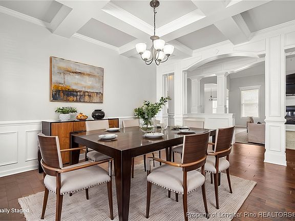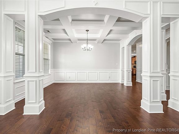 This is your Dream Home! Step into this elegant 5-bedroom (2 with ensuite full baths), 3.5-bathroom where sophistication meets comfort. Upon entry, you're greeted with an open floorplan, soaring ceilings, 2 story foyer & family room, coffered ceiling in formal dining, wainscoting, an office, open kitchen w/ large island, granite counter-tops, black stainless-steel appliances includes a Samsung Smart refrigerator with a family hub, walk-in pantry. The columns and arches make a bold statement along the catwalk that overlooks the huge family room. Primary suite w/sitting area & en-suite is located on main floor! The home also boasts luxury vinyl plank flooring on the main floor, brand new carpet upstairs, & fresh interior paint throughout. Close to Ft. Liberty and Cape Fear Valley. Don’t miss out on this incredible opportunity to own a piece of Fayetteville's charm. Schedule your tour today!! Don’t miss the community pool!!