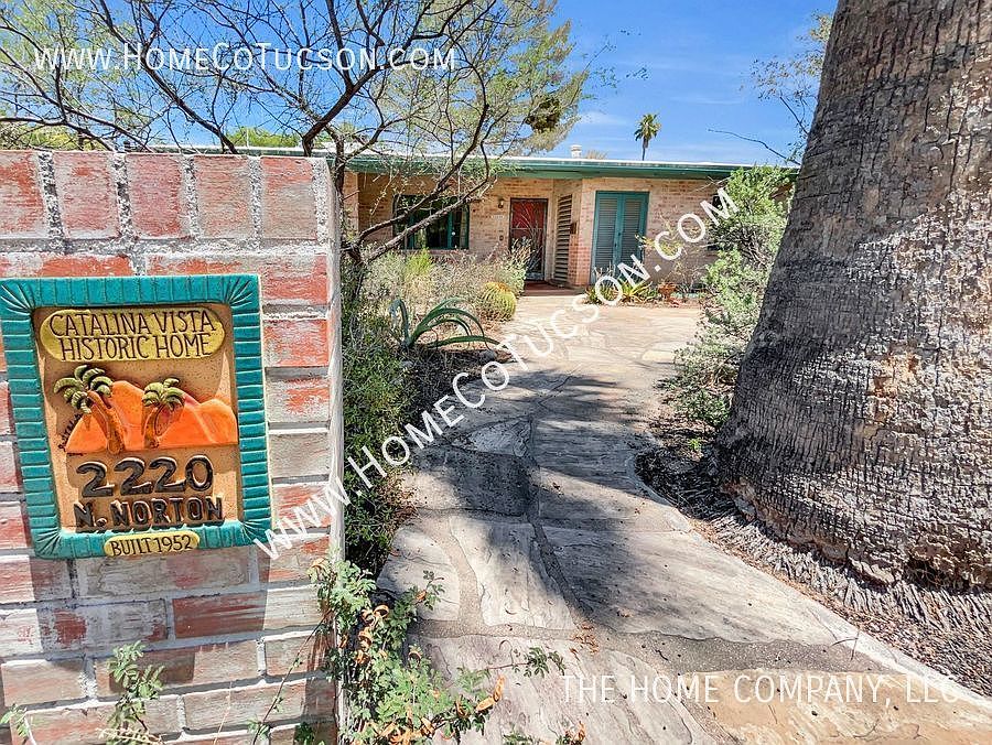 Discover the unique charm of this historic home at 2220 N Norton Ave in Tucson's desirable Catalina Vista neighborhood. Built in 1952, this brick home exudes vintage character and is located near Arizona Inn, Banner University Medical Center, and the University of Arizona. With 4 bedrooms and a split bedroom floor plan, the 4th bedroom offers versatility as an office with its own entrance to the front parking area and exit to the back patio. Inside, you'll find high wood beam ceilings, an updated kitchen, a dining area, and a spacious family room adorned with a decorative fireplace, wood beam ceilings, and an abundance of windows. Only one bedroom is carpeted, ensuring a blend of comfort and classic style. The master suite features a walk-in closet and en suite bath. The backyard is a serene oasis with mature desert vegetation, a large covered patio, and a storage shed. Additional features include air conditioning, off-street parking, and monthly landscape service. Enjoy outdoor living with flagstone paved patios and a charming covered front porch. Don't miss the opportunity to make this unique and historic Catalina Vista home yours! VIDEO TOUR: Explore this property with our comprehensive video tour to get a closer look at every detail before scheduling an in-person visit. **Walking Tour** **Virtual Tour** HOA: NO HOA UTILITIES: Paid By the Tenant Monthly Landscape service included FIREPLACE & FOUNTAIN ARE DECORATIVE ONLY- NOT FUNCTIONAL Furniture not included and will be removed prior to move in. Nonqualified support animals are subject to monthly pet rent & additional non-refundable fee per pet. SECTION 8: Accepted within the approved voucher amount. Section 8 application to provide a copy of their voucher and paperwork when submitting an application. For more information or to schedule a showing, please reach out to us via: If our available viewing times don't fit your schedule, don't hesitate to contact our leasing department to arrange a private tour. This listing is proudly brought to you by The Home Company, which is dedicated to shaping the modern-day real estate experience. The Home Company is an Equal Opportunity Housing provider, and all our agents are licensed REALTORS. Prospective tenants acknowledge that The Home Company, LLC acts as the authorized Agent for the Landlord, exclusively representing the Landlord in all property-related transactions, whether for sale or lease. The Home Company, LLC will advocate and negotiate on behalf of the Landlord. Carpet In One Bedroom Covered Front Patio Covered Patio Formal Dining Area Full Size Washer & Dryer Hook Up Gas Stove Lots Of Windows & Natural Light Monthly Landscape Service Included Split Bedroom Floorplan Updated Kitchen Vinyl Flooring Walled Rear Yard Wood Beam Ceilings