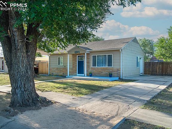Welcome to your new home in a delightful and inviting neighborhood! This picturesque property boasts an ideal location close to shopping, restaurants, the Cheyenne Mountain Zoo, Quail Lake, Fort Carson, and so much more. The exterior charm is matched by the warm and welcoming interior, creating a perfect haven for relaxation and enjoyment. Surrounded by beautiful shade trees, the front patio invites you to sit and savor the peaceful surroundings. The large, fenced-in backyard includes fruit trees. It offers plenty of space for outdoor activities including a storage shed for your convenience. The well-maintained privacy fence, accented by attractive solar lighting, enhances the ambiance and ensures your seclusion. A spacious concrete pad and table, umbrella, and chair set provides the perfect spot for outdoor living and entertainment, while central air conditioning ensures your comfort year-round. This home is modern, up-to-date, and move-in ready, promising not to disappoint. Inside, you'll find lovely LVP flooring throughout the living areas and plush carpets in the bedrooms. The kitchen features classic white cabinets and stainless steel appliances, while the bathroom showcases a beautifully tiled shower. Additional storage space in the laundry room adds to the home's practicality. With its charm and pristine condition, this house is the perfect clean slate for your new beginning.