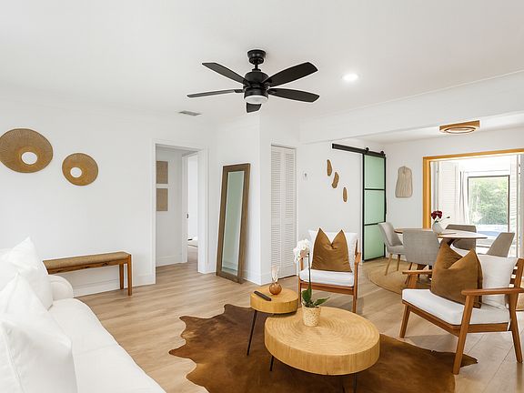 Out back, a tropical private oasis awaits complete with a sparkling pool, and lounge area, and plenty of space for entertaining or relaxing under the Miami sun.