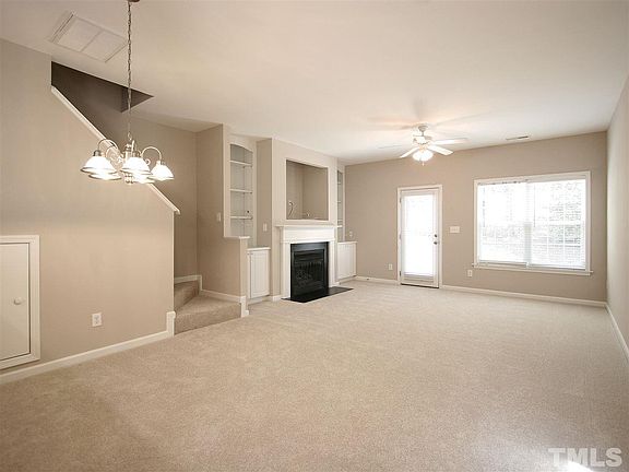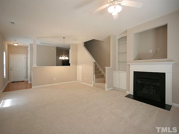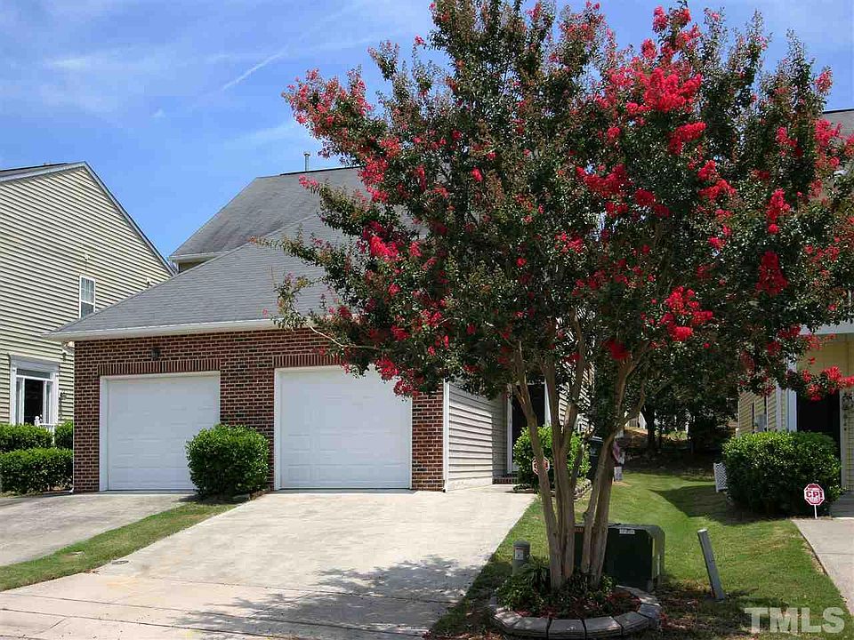 Delightful end-unit townhome. Garage. Lovingly cared for. BRAND NEW CARPET. Interior freshly painted. Two masters each with en suite full bath. 1st floor powder room. Open concept floorplan. Kitchen has lots of counter space, white cabinets, black appliances. Refrigerator inc. Hedingham has 2 pools; walking trails; lake; 9,000sf athletic center for fitness and cardio; indoor basketball; aerobics room; tennis. Free golf after 3pm in the Summer (1pm in Winter). Convenient location. Easy commute to WakeMed.