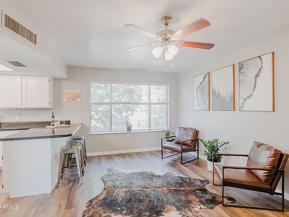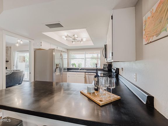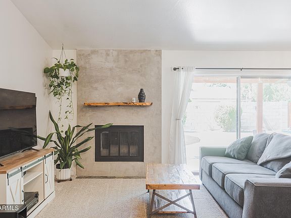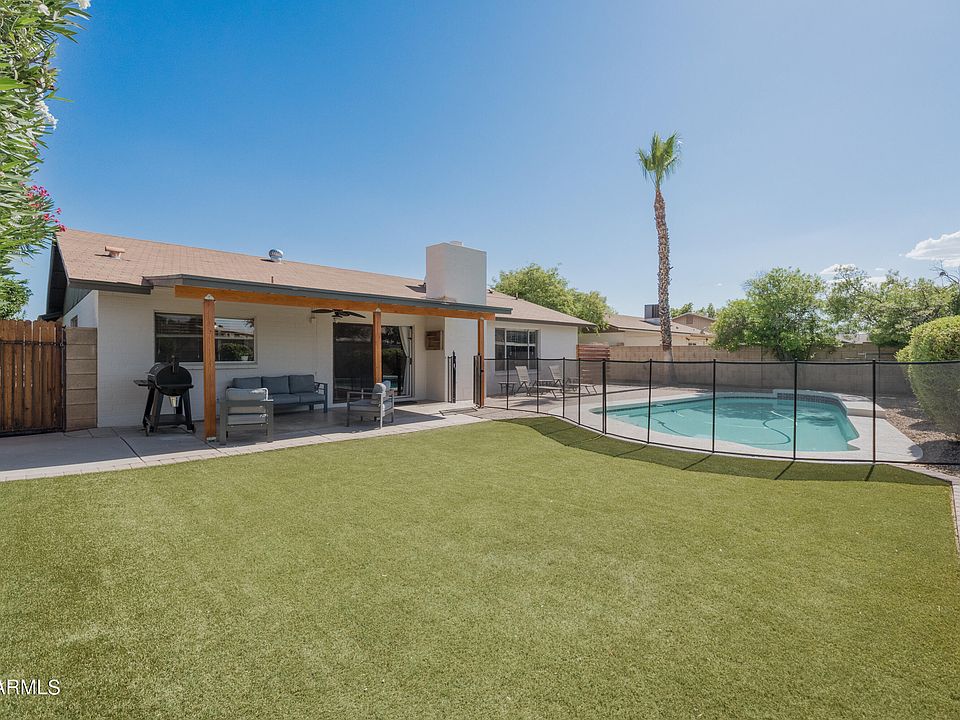 Welcome to this beautifully updated home featuring new plank flooring throughout. The kitchen boasts a charming farm sink and is complemented by a sleek concrete modern fireplace, adding a touch of contemporary elegance. The living space is enhanced by an exposed wood beam, creating a warm and inviting atmosphere. This home is equipped with modern conveniences, including a smart thermostat for optimal comfort and energy efficiency. The air conditioning system is only 2 years old and has been enhanced with additional duct work and extra tonnage, ensuring a cool and refreshing environment during the hot summer months. The carpet in the home is just 3 years old, providing a soft and cozy feel underfoot. Step outside to... discover a picturesque backyard oasis with a delightful pool and low-maintenance artificial turf, perfect for relaxation and entertaining.