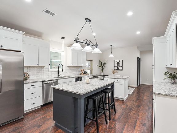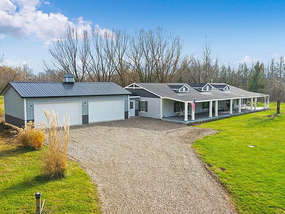 Must see this top to bottom immaculately remodeled move in ready 4 bedroom, 2 1/2 bath ranch style home w/ 5.874 acres of land w/pond, 2376 finished square feet & enough space for 2 home offices. 2020 remodel features include added mudroom, increased ceiling heights, attached 24' x 40' oversized 4 car garage, 936 square foot covered front porch, 2 patios, added 4th bedroom, laundry room w/ barn doors/ cabinets/ sink & tile floors, kitchen w/ stainless steel appliances/ cabinets/ granite counter tops w/ under mount sink, can lighting, flooring, exquisite tile work for backsplash & bathrooms w/ custom recessed niches, lights/ ceiling fans, plumbing fixtures & fireplace. Major mechanical 2020 updates include HVAC, tankless water heater, 200 amp electrical, plumbing, insulation, windows & roof