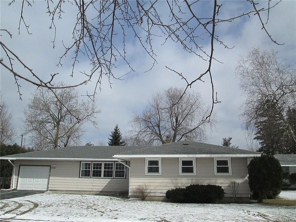 1 level living, ideal 3 bedroom & 2 bath ranch conveniently located between Watertown and Ft Drum. Public water & sewer yet only 2 taxes, w/natural gas heat for added economy. Large circular floorplan, spacious bright living room, gleaming HW floors throughout. Large sparkling white modern applianced eat-in kitchen. Adjoining XL family room/playroom/ or tv room w/electric heat & stone fireplace. Updated family bath plus master bedroom suite w/shower bath. Full basement w/exercise room could be expanded. Attached 1 car garage, quiet U shaped street, recent roof & windows. Dog kennel w/run stays.