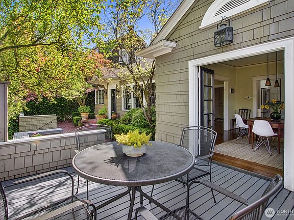 Elegant and peaceful, this remarkable bungalow lives large in North Capitol Hill - close to the University of Washington, Downtown Seattle, Bellevue, and the magnificent Volunteer Park. Timeless elegance greets you with original hardwood floors, ornate moldings, and rich period detailing. A light-filled, remodeled kitchen flows to the dining room, which opens to the deck and patio—ideal for seamless indoor-outdoor entertaining. Formal living and dining rooms welcome guests, while a private back hallway leads to tranquil bedrooms and a full bath. Elevated above the street for true privacy, this home provides beautiful greenery out every window. The generous basement offers an office, half bath, storage and access to the garage w/ EV charging