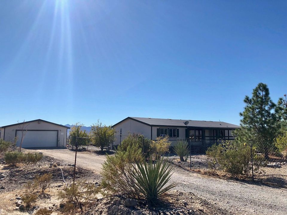 HOME ON 5 ACRES w/AMAZING VIEW!!! ZONED COMMERCIAL AND RESIDENTIAL - 3 +, 2 bath, w/family room, 2 car detached garage, front deck to watch sunset & back deck to watch sunrise, magnificent views of the mountains. Maintenance on the home has been kept up to date and also offers a reconditioned A/C unit. 50 AMP RV service comes with this home. Grown fruit bearing trees w/desert landscaping.