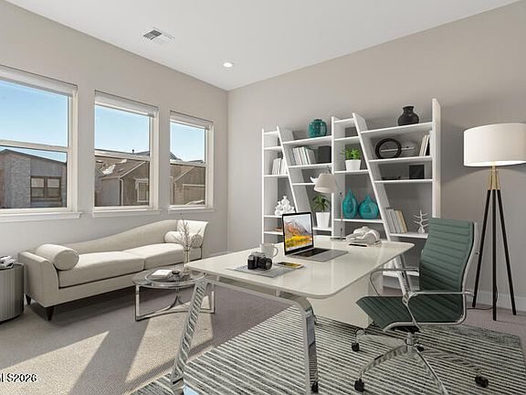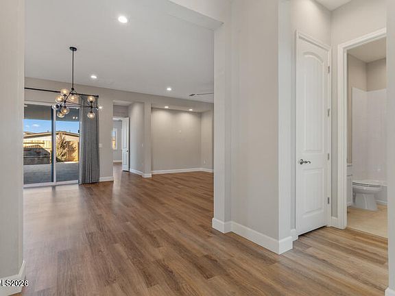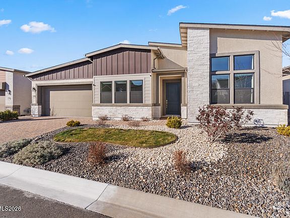This beautifully built home in the Caramella Ranch 55+ community offers 2,262 square feet of living space, featuring 2 bedrooms, 2.5 bathrooms, and a thoughtful open floor plan with high-end finishes. Notable interior highlights include a floor-to-ceiling rock wall fireplace, luxury vinyl plank flooring, and neutral colors throughout. The well-designed kitchen is equipped with a large center island, quartz counter tops, stainless steel appliances, farmhouse sink, breakfast bar, premium cabinetry, and a roomy walk-in pantry. The spacious primary bedroom suite serves as a relaxing retreat, complete with a generous walk-in closet and a deluxe primary bath featuring a dual-sink vanity, large walk-in shower, and private water closet. Additional interior features include a secluded secondary bedroom with a sizable closet, a large den/office off the front entrance. To the rear of the home is a spacious bonus room that can act as a family or game room with a sizable linen closet, and a half bath. The residence also includes a large laundry room with cabinetry and a sink, as well as a convenient drop zone. The sellers have added several upgrades including new window coverings, ceiling fans, and updated fixtures. The backyard has a large covered paver patio for relaxing and enjoying the water feature while taking in the views of Mt. Rose. The finished, painted garage includes baseboards, a storage area, and a tankless water heater. Create your own group or join an organized group of residents in hiking, biking, walking, reading, coffee, wine, painting, travel, or golf. Living in Caramella Ranch offers a vibrant lifestyle with access to premium community amenities such as swimming pools, fitness facilities, pickleball courts, and the clubhouse that is just a short walk away. The perfect location for easy access to local shopping, restaurants, skiing, and the greater Reno area.