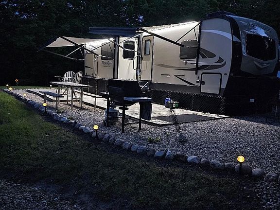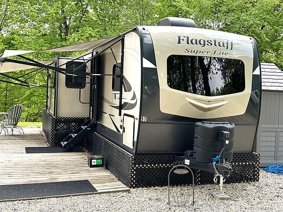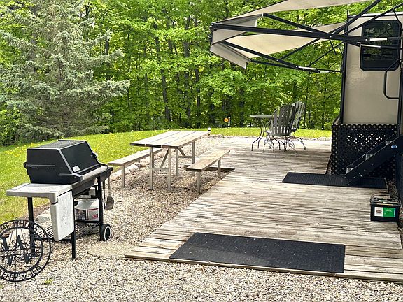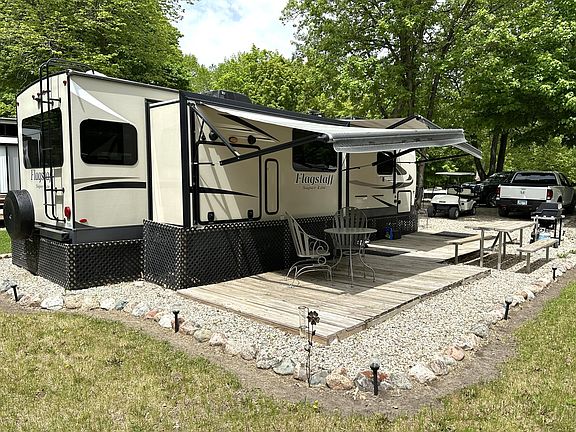 There’s a WOW factor going on here! Gorgeous 2019 ForestRiver Flagstaff Superlite trailer beautifully set up & skirted in popular Wildridge RV Assoc on Lobster Lake. This is a very upscale unit featuring attractive interior with kitchen, fireplace, hide-a-bed, reclining love seat with heat & vibration, tons of storage spots & all the furnishings are included! Exterior has outdoor kitchen, 2 sun awnings, spot to hook -up a TV, patio, furniture, grill, AND a golf cart! There is also a storage shed stocked with yard essentials. This complete package includes a dock that stays in the water all year, a 2019 20’ Suntracker DLX fishing pontoon with 4-stroke 60 HP Mercury motor, cover & trailer! This could be the epitome of complete lake packages!!! Association maintains common grounds, has great sandy beach, boat launch, covered picnic area, laundry facility, fish cleaning house & parking for your boat/trailers. With the extensive 5000’ of shoreline & 24 AC of land, it’s like your own park!