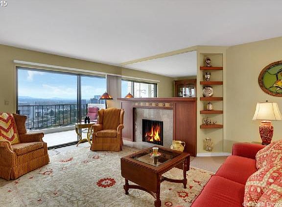 Spacious light filled rooms in this lovely updated condo w/wrap around views of city/Mt.Hood/river; double windows/patio doors throughout. Tiled balcony adjs LR/FR, 2nd balcony adjs MBR w/FP/walk-in closet/dressing area. 3rd BR with built-ins makes a great office/den. Walk-in storage in basement. Complex features 24HR concierge/indoor & outdoor pools/meeting rooms/work-out facilities/guest parking. Pets welcome.