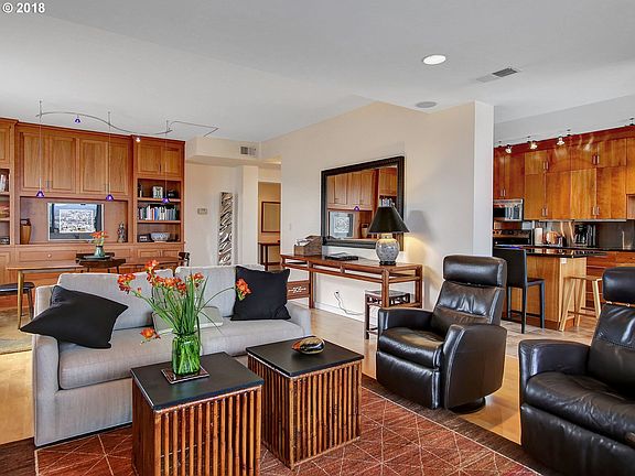Gorgeous unit with 3Bdrms, 2baths,2 fireplaces & two huge balconies w/amazing Mountain,River,City & West Hills views. Light open room concept w/Maple floor and 9 ft. ceilings great for entertaining. Gorgeous built-ins in Living Rm and Dining Rm. Gourmet Kitchen w/Cherry cabinets, granite counter-tops, stainless steel appliances & back splash opens to huge deck with Mt. Hood view. Master with cozy fireplace and large deck. On Max line.