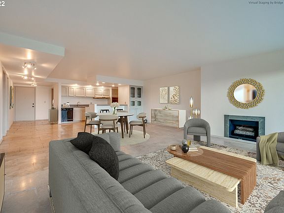 Light and bright condo in the Grant Tower featuring tile floors, new interior paint, gas fireplace and large covered deck with view of Mt. Hood and river. 2 spacious bedrooms. Walking distance to shopping, restaurants, theatre and public transportation. Indoor and outdoor pools, fitness center, sauna and hot tub. Strong HOA and no rent cap.