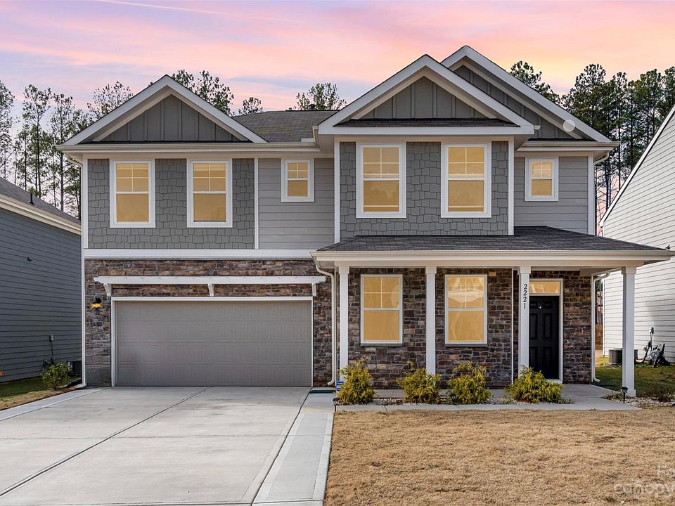 - Brick Partial, Hardboard Siding, Stone Veneer