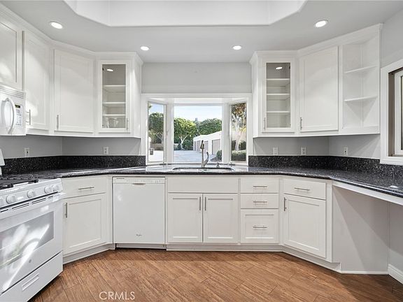 Located directly on a beautiful greenbelt this expanded single story 3 bedroom, 2 bath, 1,342 square feet, home is a must see end unit with only 1 common wall. Featuring a wood burning fireplace in the great room. The home has been freshly painted and has ceramic wood flooring in the main living spaces, a tankless water heater, ceiling fans and skylights. The kitchen has granite countertops, new fixtures and cabinet doors, coffered ceiling, bay window, extensive prep and storage space. The primary suite has a bay window, large closets, ceiling fan and walk in shower. The large patio on the greenbelt is a highlight of the home, with glass enclosure provides nice privacy and is pet friendly. The 2 car garage is directly connected for easy access. Low HOA fees includes 2 pools, spa and BBQ. Close proximity to schools, shopping, beaches and John Wayne airport.