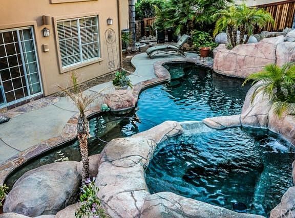 One of Canyon Lake's most visually stunning Pool home with magnificent views from prestigious San Joaquin Drive West. Quality Everywhere! Extensive and tasteful use of tiles, marbles, hardwoods, and many other high quality enhancements. Four bedrooms, including a master suite that is an architecturally inspired dream of its own. Remarkable living and entertaining areas, with a centrally-designed kitchen that is open to all of this: A beautifully tiled great room with dining area, spacious lunch/breakfast bar, family room with fireplace, and also to a separately situated lower level living room and its separate fireplace. The skillfully integrated design of the entire living area is truly a work of art. And, the Back Yard! The exquisitely designed faux rock pool, spa and waterfall with cave is a masterpiece all it's own! Pebble Tech... energy saving pump... fiber optic lights in the cave. And, outdoor speakers. All beautifully situated in a garden-like setting with perfectly placed palms. This exquisite home has a total of Three fireplaces and Two wet bars. Extra Deep Three car garage ... Four Bedrooms. 3 Full Baths. ...Two Beautiful view decks.
