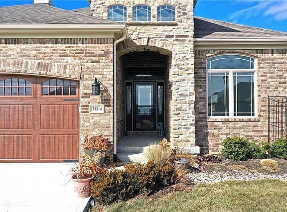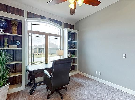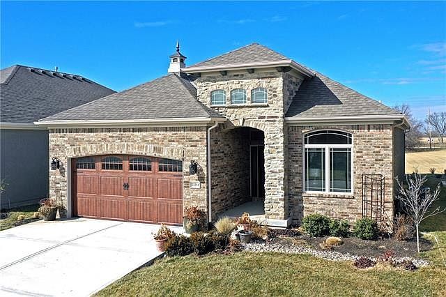 Work from home in this ALMOST NEW Rev 1.5 story maintenance provided villa. Main floor features beautiful hardwood floors, stone fireplace, granite kitchen with SS appliances, under cabinet lighting and large pantry. Laundry conveniently located off large master suite with walk-in shower, granite double vanity and HUGE closet. 10ft ceilings throughout main floor complete the open floor concept. Finished basement ready for entertaining with stone accented wall and wood accented ceiling. Multiple builder upgrades make this home really special. Property backs into large green space adding additional privacy. Excellent Olathe schools and great access to highway.