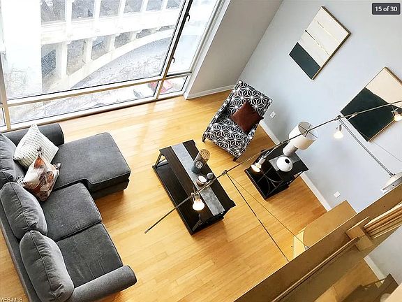 Once in a lifetime opportunity to live in the heart of it all. Just a short walk from the Flats, as well as the West Side market, and all the incredible hot spots Cleveland has to offer, this beautiful condo has been home to professional athletes and young professionals alike. This stunning 11th floor, 3 story penthouse boasts amazing views of both Downtown Cleveland and the Cuyahoga River. The unit boasts 3 bedrooms and 2 bathrooms. Featuring an open, contemporary layout, the kitchen comes equipped with beautiful maple cabinets, granite countertops and stainless-steel appliances. The kitchen opens into the dining and living areas with 20-foot, double height floor to ceiling windows and working gas fireplace. A full tiled guest bath and two bedrooms are located on the main floor as well. Head up to the second floor where you will find an amazing entertaining space that includes a wet bar with a wine and beer fridge and a pool table. Tucked just behind the wet bar is your very own full sized, in-suite laundry with washer and dryer included. A cozy office nook is located right off the entertaining area and opens onto its own private balcony. The large master bedroom, master walk-in closet and another full bath with a tiled walk-in shower and oversized jetted Jacuzzi tub complete the second floor. Up a spiral staircase to the third floor is a great area for an office or additional entertaining space that includes a second gas fireplace. The third floor room opens out on to a private rooftop deck. Here you have views of the lake to the north as well as a beautiful view of the downtown and the Guardians stadium. Summer nights can be spent on the rooftop enjoying Fireworks shows after Guardians games or relax after a long day in the hot tub. Enjoy the building amenities that feature 24-hour security, a fitness center, keyless entry, and a licensed parking spot in the attached garage. Pet friendly. Tenant will be responsible for all utilities. Message to schedule your private showing, this location will not last long!