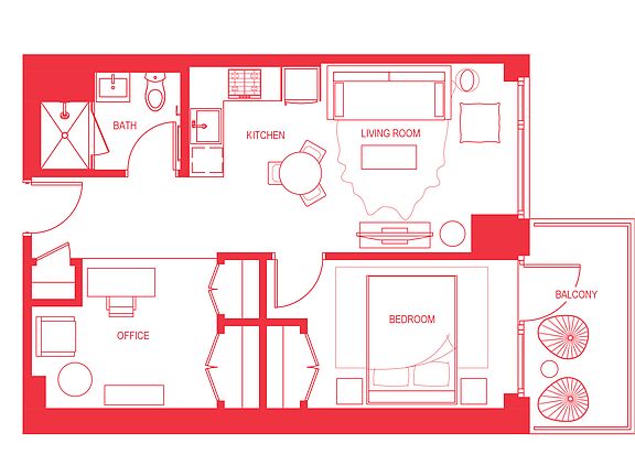 A one-bedroom unit with a home office and a balcony is available for rent.