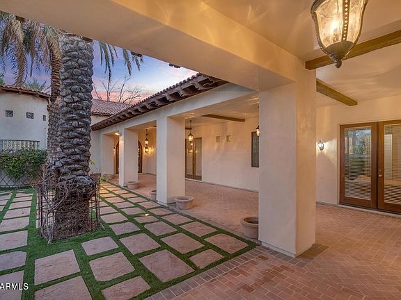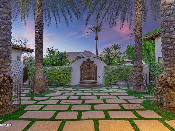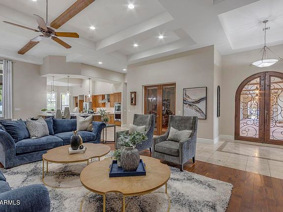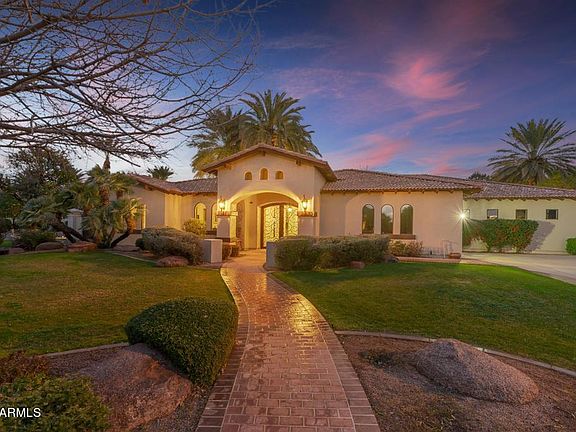 Welcome to Avalon Grove, a highly sought after gated Mesa neighborhood with just 22 homesites all with large lots & beautiful custom properties. This single level 4 bedroom plus executive office suite, 3.5 bathroom estate features a detached one bedroom/one bathroom casita perfect for multi-generational living, a magical Mediterranean courtyard weaving through the center of the property, more than $125,000 in custom upgrades including a chef's kitchen with custom cabinets & stunning quartz countertops, an entertainers backyard with glass-gated heated pool & spa, built-in trampoline, putting green & outdoor kitchen all on a large private lot with a 4 car garage & the most beautiful & serene lush landscaping you'll find in this former orange grove. The attention to detail is incredible... in this home from the stone walkways to the high ceilings and wooden doors, to the custom beams and expertly crafted corners, and each built-in from the living room entertainment center, to the master bedroom fireplace, the executive office suite desk and shelves, and the kids homework space in the guest wing. The split floorplan starts at the dramatic entry to the home with the iron and glass doors with the luxurious master suite with dual closets, private fireplace, ensuite bath, and access to the private courtyard on one side, the executive office suite with double door entry & library shelves off of the living room in the center of the home, and the guest wing with long private hallway, homework area, three bedrooms - one with a private ensuite and courtyard access and one set with a jack and jill bath in between. A large laundry room, half bath and four car garage finish the primary living space all before retreating to the backyard with extended covered patio and plenty of room for entertaining. With access to the Mediterranean courtyard and fountain from all points of the home, the guest casita features a full living room, bedroom area, closet and kitchen set up and full sized bathroom with shower ideal for multi-generational living. Relax on the grounds of your custom estate, or walk a few steps down to the community tennis, basketball and pickle ball courts - or head out the gates to the nearby shopping, dining, recreation, public and charter schools, and all East Valley freeways for easy access to the rest of the Valley. You will not find this quality of build in a standard subdivison community - this truly is an exquisite home.