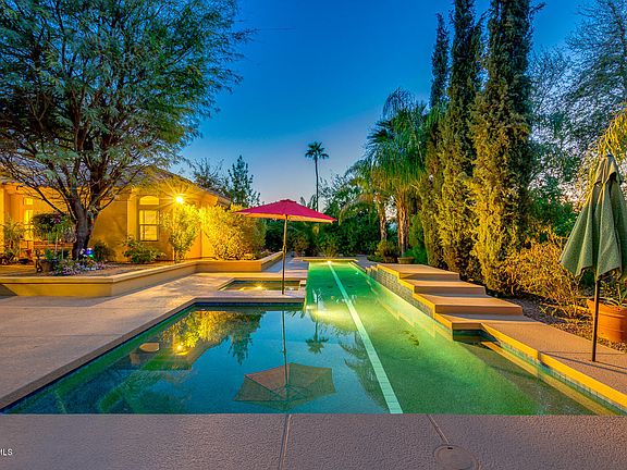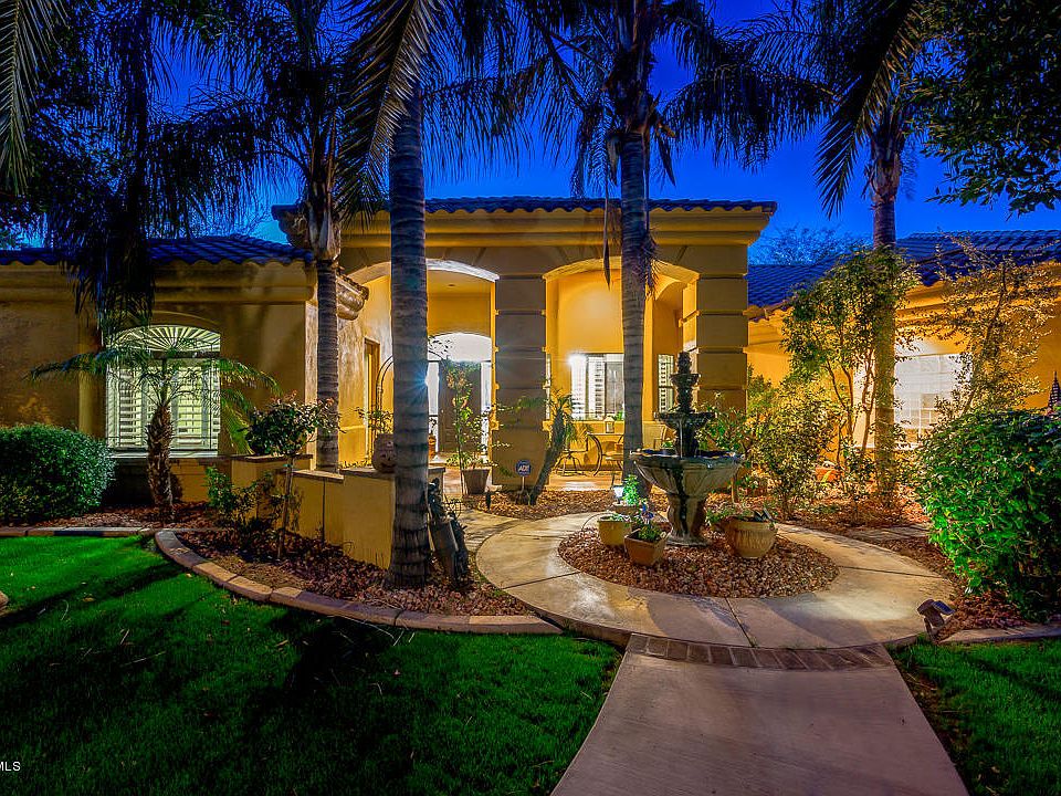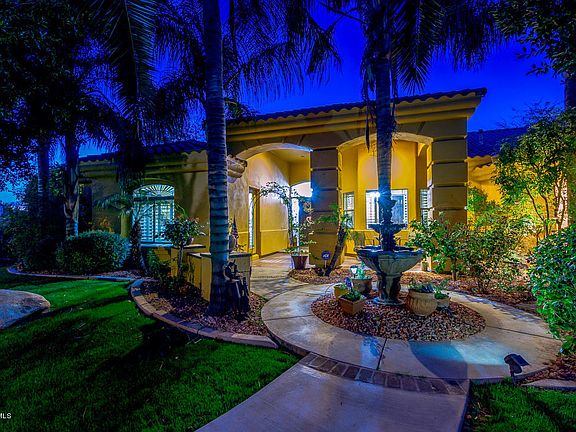 Nestled amongst mature citrus and surrounded by lush trees is this elegant CUSTOM HOME in the exclusive gated enclave of Avalon Grove. Gracing 3,569 sf, this sophisticated single level home offers an open & spacious floor plan with a stunning heated lap pool with spa, situated on approx. 3/4-acre corner lot. The grand entry with high ceilings & beautiful backyard view welcomes you the minute you walk through the door. This provides an abundance of natural light throughout the large living and dining rooms with impressive high ceilings, tile flooring, and various niches. Chef's kitchen offers a plethora of storage w/walk-in pantry, granite counters, dbl oven, Dacor induction stove top, center island, breakfast bar, wine cooler & opens to an inviting family room w/ a stylish brick fireplace. Relax in the Mstr bedroom with a fireplace, entrance to garden, ensuite bath w/his and her vanities, jetted tub, separate shower & w-i-closet. There are 3 additional generous sized BR's (one could also be used as an office or guest room) all have own private exits. Enjoy AZ living with an extended covered patio, mature orange, grapefruit and lemon trees, hummingbird oasis, and water fountain feature. Extended length 4 CG garage, build in storage, RV gates, central vac, H2O softener. Top-rated schools. Easy access to freeways, shopping & Phx area events. SURE TO SELL FAST!!!
