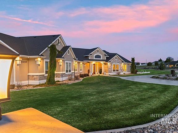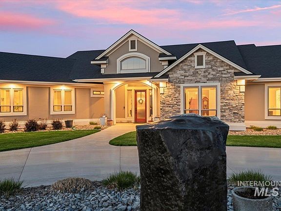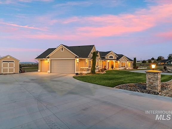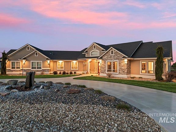 Welcome home to this custom-built gem with spectacular views for days, perched alongside the 14th Tee of award-winning TimberStone Golf Course, and located nearby Idaho's premier wine country! No detail was overlooked in the design & construction of this dream home by the current original owners. Inside you'll find soaring 10' ceilings w/11'-12' tray features, upgraded molding & wood trim accent detail, a Kitchen/Dining Area/Great Room central hub inundated with natural light and ideal for entertaining, an expansive Bonus Den space with hidden safe room, private slider access to covered Back Patios from all Bedrooms and Great Room, and a sanctuary-like Primary Suite with heated tile & shower flooring. Step outside to a 3XL-car connected bay garage with extensive upgraded heavy duty ceiling-mounted shelving storage, multiple covered back patios, plentiful garden area, and all surrounded by a beautifully landscaped and fully auto-irrigated yard with plenty of room for further pool, shop and/or other expansion!