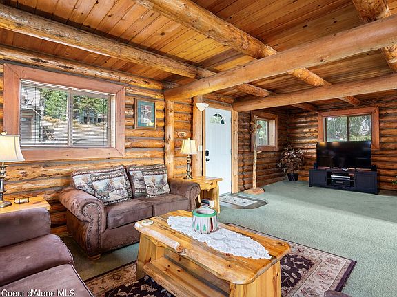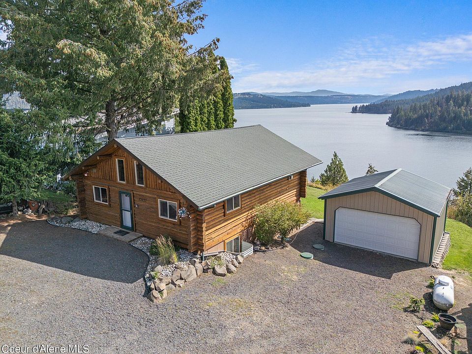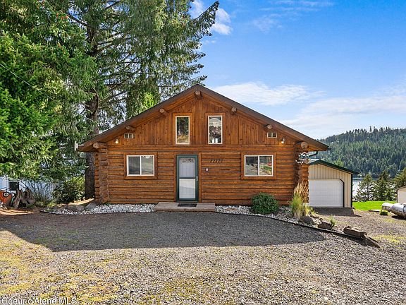 This beautiful log cabin offers a fantastic opportunity for income generation through VRBO or as a perfect private residence, all while boasting secondary waterfront access without the added tax burden. Enjoy million-dollar views of Lake Coeur d'Alene and the surrounding majestic mountains. Step inside to find a warm and inviting interior, featuring soaring cedar ceilings and a charming kitchen with a breakfast bar and stainless steel appliances. The cozy living room, complete with a gas stove, provides an ideal gathering space. With three spacious bedrooms and a versatile upstairs loft, perfect for a home gym, office, or craft room, there is plenty of room to accommodate your lifestyle. Additional features include a detached two-car garage, access to a community lakefront park, boat launch, and dock. The HOA covers water, sewer, and even a boat slip!
