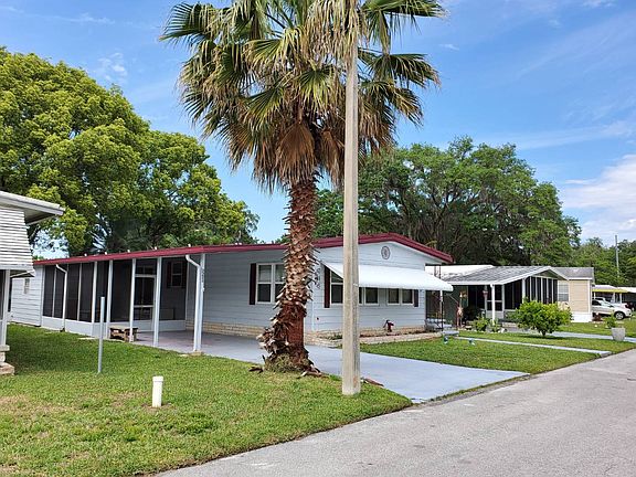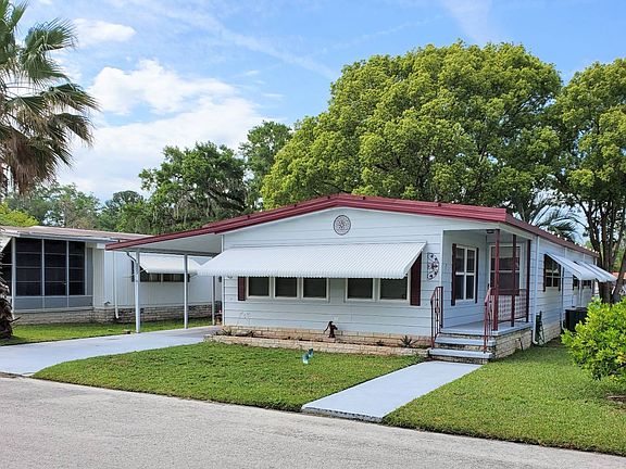 This very large double wide has a lot to offer! Located across from the pool, features plenty of parking, a screened in area at carport and screen room with vinyl windows on back facing the pool! Everything shown in this home remains with the purchase. This home offers 1440 square feet of living space with two living rooms, spacious dining area with gorgeous built in storage and roomy bedrooms. Living area has beautiful, light laminate flooring and both bathroom feature ceramic tile floors. We believe this home to have all plywood sub-floors. The HVAC unit was installed 2017/18, and the home has a shingle roof. Other upgrades include replacement double paned windows throughout, newer water heater and new sliding glass door. This home is priced to sell fast and will not be on the market for long. Located in the lovely age qualified community of Clover Leaf Farms.