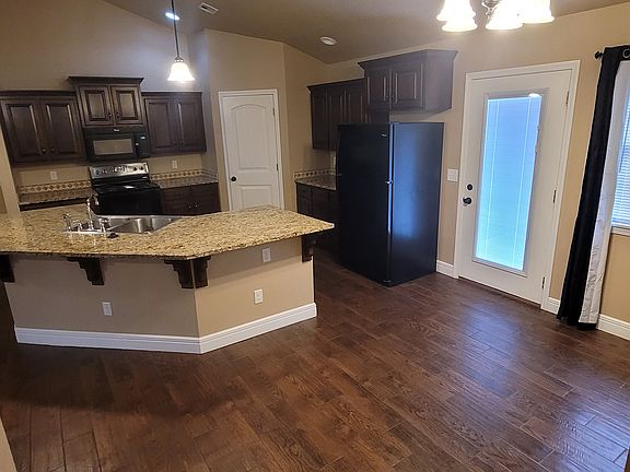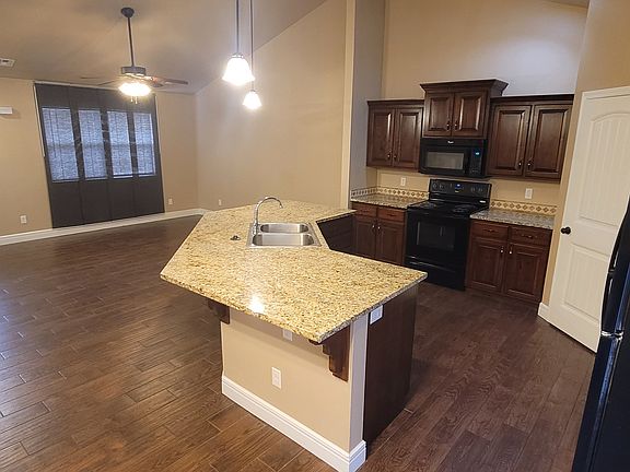 This is a beautiful 3 bed 2 bath house. gran-et island and countertop in kitchen. A spacious walk in pantry. The master bedroom has a nice walk in closet and the master bath features a separate tub and shower stall. this house has a nice two car garage and has a storm shelter as well. is has a fenced in back yard with a nice concrete patio as well.
