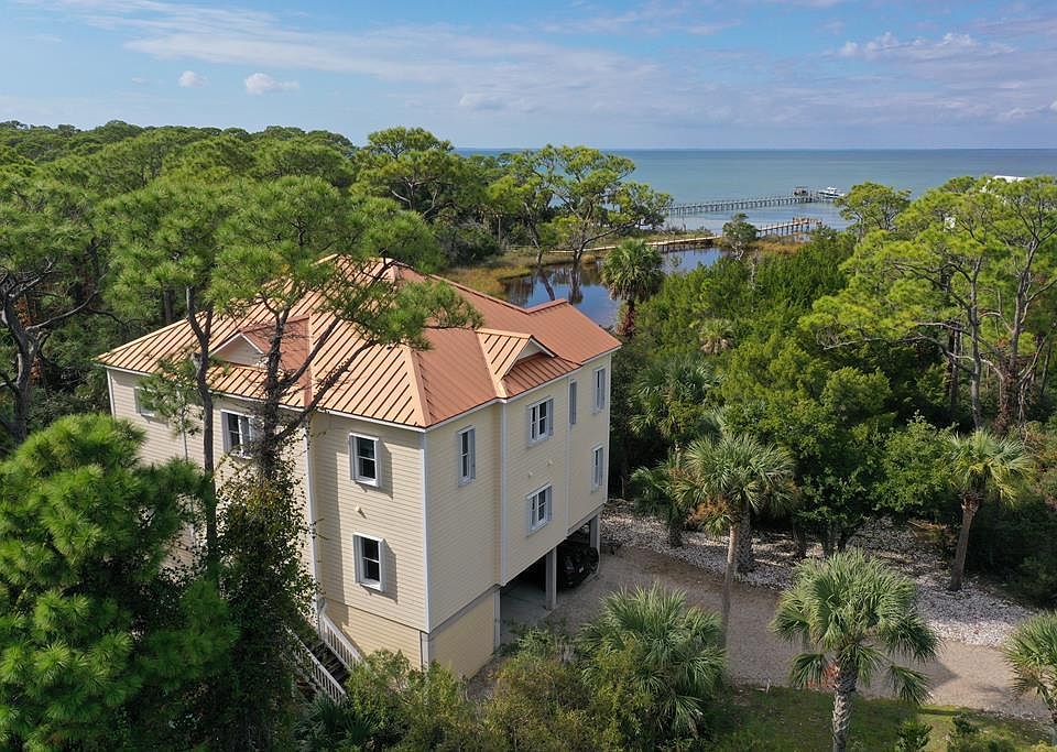 "Bourbon Bay" Well-maintained, St George Island Plantation home with Extraordinary Sunset Glow and Private Heated Pool. Bourbon Bay is poised to capture open views of Apalachicola Bay sunsets and pristine estuary habitat from multi-level screened decks and Bayside windows. 5BR/4.5BA; Three primary BRs have ensuite baths. The open floor plan with 2 living areas is ideal for entertaining. Spacious kitchen with generous cabinetry, granite countertops, black stainless appliances and ample space for shared meal preparation. Elevator access to all levels. Wet bar. 2 spacious ground level storage/exercise/workshop rooms. Bourbon Bay is solidly constructed with Hardi-plank siding, storm shutters and standing seam metal roof. Gated community with clubhouse, 2 community pools, 2 bike paths, fitness room, tennis and pickleball courts and Beach. 3300' paved airstrip. This private residence is offered furnished.