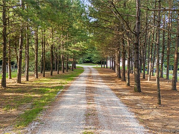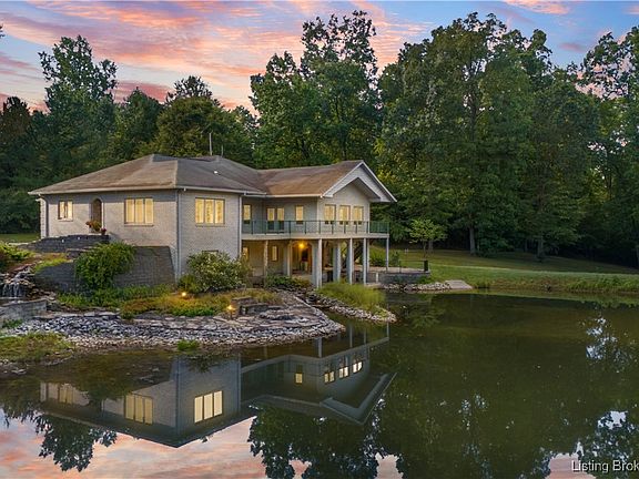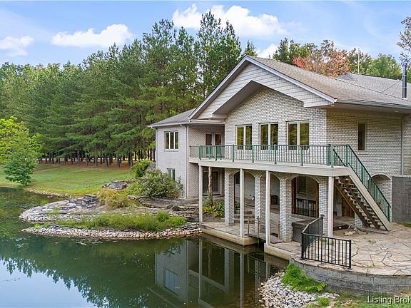 Welcome to this stunning estate on 11.85 acres with a private 2-acre stocked lake. Designed for peaceful living, the home features a luxurious primary suite on the main level with a stone fireplace, dual walk-in closets, and a huge ensuite. Access your private sunroom from the primary complete with a kitchenette and balcony. The chef’s kitchen with dual ovens and quartz countertops opens to a dining area with lake views. The lower level includes two bedrooms, two full baths, a flex room, and a media room that could be another bedroom (no egress). Custom trim and locally milled wood floors add charm. Enjoy outdoor activities with an electric boat lift, trails, fire pit, and a man-made creek and waterfalls! The home has 3 kitchens and 2 laundry rooms! This oasis is listed UNDER APPRAISAL!