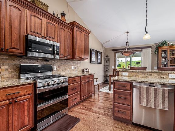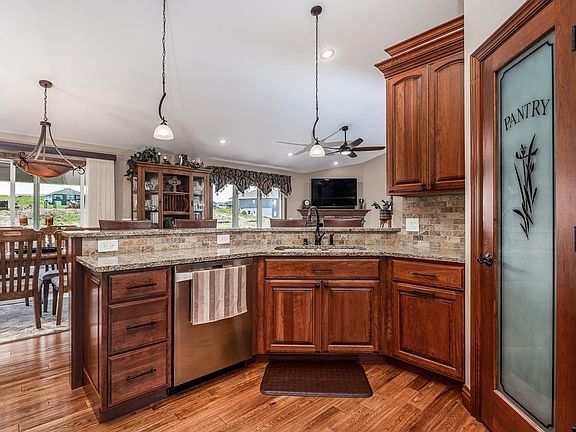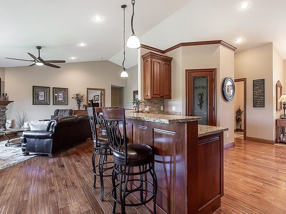 This awesome home is situated on one the the best cul-de-sac lots in Carver subdivision. On the main level there is 1900' with 3 bedrooms, 2.5 Baths, a huge laundry room, 3 car garage and much more. Other features on the main level are a custom cherry kitchen with granite tops, walk in pantry, tiled backsplash, SS appliances, lots of hickory hardwood floors, fireplace, no step/level entry garage, covered rear deck with hign end maintenance free deck and railing, Lorex security camera system and much more. This is a former parade home so it has lots of upgrades like oversized oak trim, 6 panel oak doors, tiled master shower, whole home water filtration system, water softner, energy star rated mechanicals, 2 x 6 construction, 9' high walk out basement and an awesome split bedroom floorplan. The finished lower level has another 1300' of finished living area and no expense was spared, there is a see thru linear fireplace, awesome bar/ pool room, another bedroom and bath complete with 2nd tiled shower w/weathered wood plank style ceramic tile floor and rest of lower level is luxury vinyl plank. This 1/2 acre lot sits at the end of a cul-de-sac and the yard is flat and usable plus there is a green space right behind it and a new wetland pond which is refuge for ducks, pheasants, wild turkey and other wildlife. It is only 2 blocks from Carver and Roosevelt schools, plus close to shopping and healthcare. The exterior the home has great curb appeal and the yard was professionally landscaped completed with custom paver edging. You won't find a cleaner more well kept home.