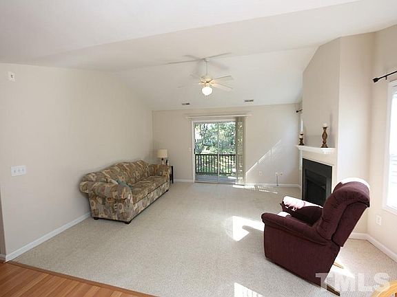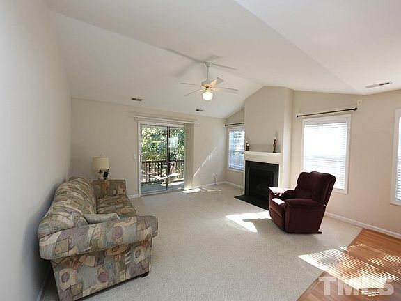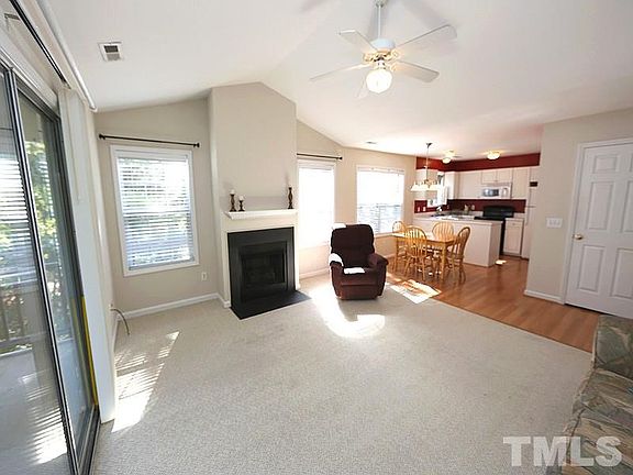 Open floor plan welcomes you into this 2 bedroom condo in a prime location in Cary. The large master bedroom includes vaulted ceiling, ceiling fan and walk in closet and connects to a master bath with jetted corner tub and separate shower. The family room features vaulted ceiling, fireplace, ceiling fan and lots of natural light. Laminate floors throughout kitchen/hallways. Roof 2011, HVAC 2011. HOA dues include: cable, water, trash and use of pool. Two separate storage areas. Move-in ready!