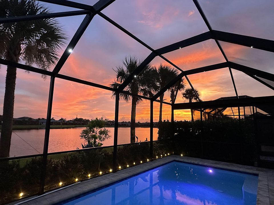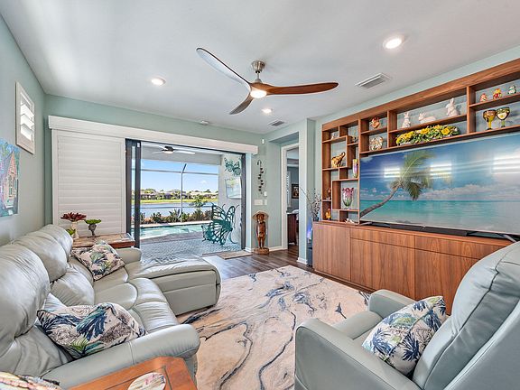 Motivated seller! Can't afford new, come to see this 'like new' home. Stunning lake views and luxury living in Manatee Cove. Wake up to spectacular, resort-style views every day in this exceptional two-bedroom, two-bath plus den home in beautiful Manatee Cove. Offering the ideal blend of comfort, elegance and convenience, this property has everything you could want and more. Elegant and spacious layout, guests are greeted through a spacious screened front patio, ideal for enjoying the outdoors. Inside, the open concept living space is designed for relaxation and entertaining, featuring a neutral color palette, plantation shutters and luxury vinyl plank flooring throughout. The gourmet kitchen is a chef's dream with white shaker cabinets, quartz countertops, a designer tile backsplash, rollout shelves and a large center island. Top-of-the-line stainless steel appliances, include a five-burner gas range with a warming tray and vented hood, making this kitchen ideal for any culinary enthusiast. An outdoor oasis, so step through the pocket sliding glass doors into your private screened lanai, featuring a covered seating area, electric storm shutters, privacy screens, Nebula cage lighting and a saltwater pool. With stunning sunset views over the lake, this space is the ideal retreat for relaxation. Luxurious owner's suite where the suite offers a tranquil escape with a tray ceiling, custom walk-in closet and a spa-like en-suite bath with dual sinks, quartz countertops, and a frameless glass-enclosed walk-in shower with a built-in bench and multiple shower heads. Versatile guest and flex spaces where a beautifully designed guest bedroom provides easy access to a well-appointed bath and custom closet. The versatile flex room, complete with ample storage, can function as an additional bedroom, office or exercise room. The home also features a fully equipped laundry room. Premium features and curb appeal where this pristine home boasts impact-resistant doors and windows, a tile roof, paver driveway and walkways, professional landscaping, a two-car garage with epoxy flooring and a secondary refrigerator. Additional upgrades include a Generac whole-house generator and video security system. Community and location perks where Manatee Cove residents enjoy exclusive access to a resort-style pool, cabana and fire pit. This home is conveniently near top-rated schools, shopping, dining and beautiful beaches of Naples and Marco Island. Don't miss out on this incredible opportunity. Schedule your private showing today to experience this dream home for yourself.