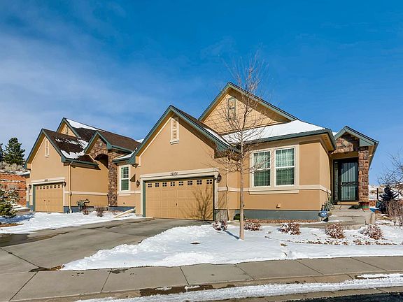 Welcome to this exceptional, stucco ranch-style patio home, with hardwood floors and a deck backing to the golf course, in a quiet location, with a large dry walled 2-car garage, main floor laundry. Enjoy the open kitchen, with granite counters and island, 42" cherry cabinets, black appliances and sunny breakfast nook. The great room is warm and inviting, with a vaulted ceiling, gas fireplace and ceiling fan. The study has french double doors and the formal dining room makes for great dinners, with friends. The master has a 5-piece bath, with granite counters, tiled shower, large soaking tub and a big walk-in closet. Enjoy the $20K custom bar and media room in the basement, with speakers, wine rack, copper sink, LED lighting. There's also a great bedroom, bath and lots of storage. Delight in this gorgeous home, with lots of space, convenient location, near E-470 and Southlands!
