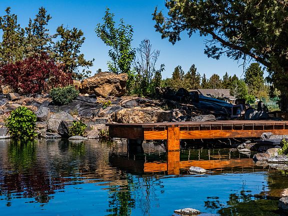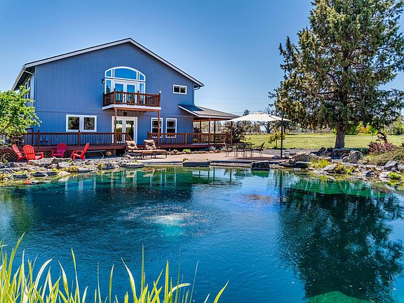 Beautiful 4 or 5-bedroom Craftsman on 7 acres w/ 5 acres of irrigation rights. 4 bedrooms upstairs including the primary w/ a balcony looking out to the mountains. The downstairs bedroom(s) are currently an office space & could be split into 2 rooms. Plenty of options w/ 2 living areas & a gorgeous kitchen w/ huge island, breakfast bar, many newer appliances, which overlooks the uniquely designed Natural Swim Pond/Pool. The Swim Pond features a 6' deep swimming area, deck, & waterfall...enjoy the views of the swim pond year-round. Perfect for family gatherings and or entertaining w/ a covered area deck. Meandering pathways through wildflower gardens, 4 acres fenced, ready for crops or pasture for your horses, goats, or cattle. Country living at its best, yet close to everything. Minutes to Bend. A unique property to call home!