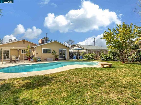 Single-story on great .17 acre lot with pool! Front courtyard behind fence to provide privacy to porch/entry. Backyard is spacious with nice size patio and lawn areas surrounded by palm trees. Covered pergola over patio off kitchen/dining area. Master has sliding doors to backyard, and ensuite with spacious glass-enclosed shower. Paved RV Parking. Two Car Garage. Close to BART!