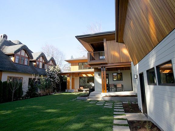 G.S. Bock designed home with a living room that is partially indoors and partially outdoors thanks to a glass wall that slides away into the traditional wall. The basement was dug deep to provide relatively high ceilings for a floor intended to function as fully as those above ground.