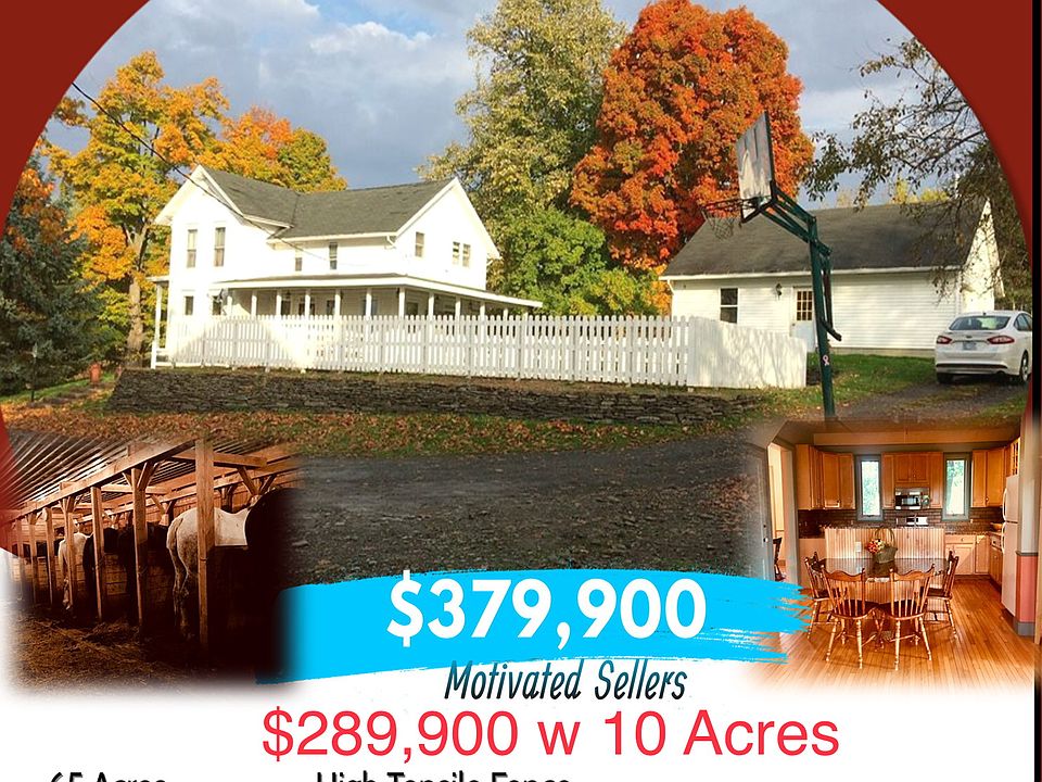 Turn of The Century Farm, Move In Ready. Gorgeous Colonial 4BR Renovated House, 10 Acres (more available), 2 Large Barns with Water and Electric, Stalls and Storage. Fenced Pastures, Inground Pool, Heated Garage with Water and Electric. Breathtaking Views Year Round. The House Features 9 1/2' Ceilings throughout, Huge Country Kitchen, 2 Living Rooms, Mud Room, 2nd Floor Laundry, Massive 2nd floor bathroom with Jacuzzi Tub and Walk-In Shower. The School System is Top Notch with Small Class Size. Enjoy Rural Country Living, while Only Minutes to the Village, Schools and Shops. 55 Acre Adjoining Parcel Available.
