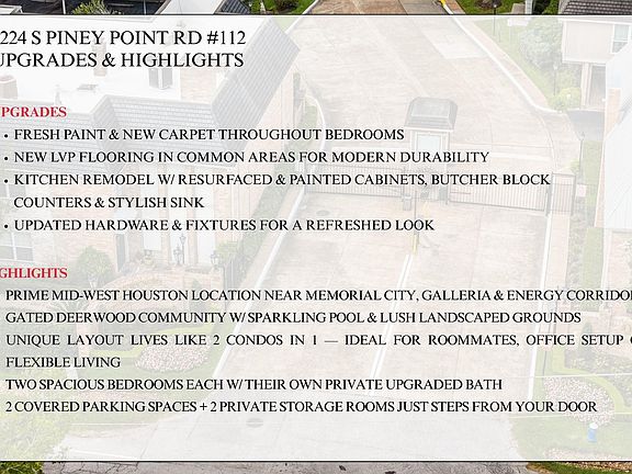 Step into style & convenience in this beautifully updated Mid-West Houston condo tucked inside the gated Deerwood community w/ sparkling pool & prime location. Designed w/ versatility in mind, the unique layout lives like 2 condos in 1, offering separate living spaces perfect for entertaining, roommates or a private office setup. Fresh paint & NEW carpet add a crisp, inviting feel, while LVP floors flow seamlessly through the common areas for durability & modern appeal. The updated kitchen boasts resurfaced & painted cabinets, butcher block counters, chic sink & new hardware—ready for everyday living or hosting. Two generously sized bedrooms each feature their own upgraded bath for comfort & privacy. Extras include 2 private storage rooms & 2 covered parking spots conveniently located just outside your door. Whether you’re searching for a stylish new home or a smart investment property, this move-in ready condo delivers flexible living & unbeatable value.