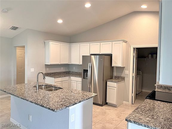 The "Pineland" model. Built in 2021. ON CITY UTILITES WITH ASSESSMENTS PAID IN FULL!! Beautiful 3 bedroom, 2 Bath Home with 3 car garage. Open floor plan with cathedral ceilings and center island kitchen. Spacious living room leads to large, covered, screened lanai. Concrete Block Construction, Under Truss Lanai, Lenox 15 Seer high efficiency AC system, Moen plumbing fixtures, Dimensional Shingles, PGT Low E Insulated windows, custom Hunter Douglas blinds, 36” upper cabinets with soft close doors, Granite Counters in Kitchen and Bathrooms, tiled shower walls, dual sinks in primary bath, Stainless Steel Kitchen appliance package, colonial style raised panel doors, electric garage door opener, 18" tile flooring throughout whole house, Stone Accents on front elevation of the home, irrigation system, epoxy coated garage floors, paver driveway. This home is in an "X" flood zone so flood insurance should not be required for your mortgage! Boat ramp on the same street!