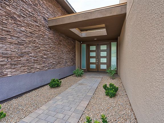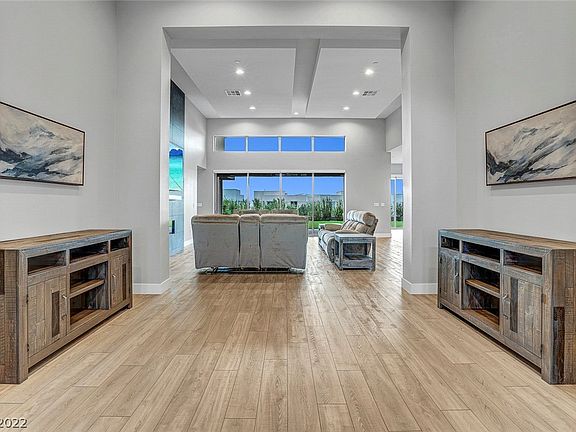 This pristine single-story home is just under 3,500 sq/ft., nestled on an elevated lot with no neighbors behind your pool-sized lot creating a private backyard paradise. A perfectly manicured, low maintenance landscape greets you as you enter a spacious open floor plan designed for entertaining. Beautiful Chef’s kitchen features top of line stainless steel appliance package, Calcutta Quartz countertops, built-in wine cooler & oversized walk-in pantry. Kitchen also includes one of the largest kitchen islands you will find! Large theater room (currently fitness center) with wet bar & built-in microwave. Primary bedroom houses an oversized closet & luxury spa-like bathroom. This modern home features a Life Source water purification system, washer/dryer, security alarm & roller shades throughout. Located by the park, in the foothills of highly desirable Henderson gated community of Axis. Minutes from endless retail & restaurants including the District at Green Valley Ranch.