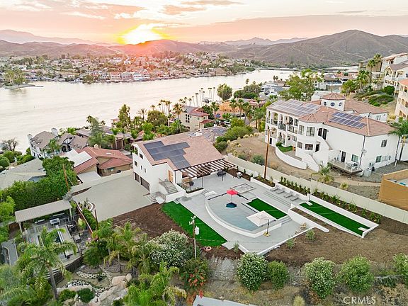 HUGE price drop and $60,000 Solar System is now FREE… Run, Don’t walk!!! This incredible home has been completely remodeled and offers breathtaking, unobstructed lake views from nearly every corner...doing a stellar job at blending rustic charm with modern elegance. Sitting on nearly a 1/2 acre (18,731sf. lot) this home can meet all your parking needs with a brand new freshly poured 5,000sf driveway, a 3 car garage and plenty of room for an RV as well as a boat, multiple golf carts, several cars and all of your other toys! Step through the grand foyer as you enter through the brand new custom stained wood door, soaring vaulted ceilings with rustic beams, a charming half bathroom, and a striking staircase adorned with rustic stone and wrought iron railings leading to a perfect private exercise room/office. The 12-foot bi-fold door opens seamlessly to a sprawling 600 square-foot covered patio, perfect for entertaining with that popular indoor/outdoor feel. The heart of the home is the wide-open kitchen, boasting wall-to-wall lake views on the west side, a massive kitchen island ideal for gatherings, custom rood, tons of counter space and a large walk-in pantry for all your culinary needs. Adjacent, the TV room, affectionately called "The Chapel," features a vaulted ceiling with custom rustic wood beams, large stone hearth fireplace and a double slider to a private balcony with wild, unobstructed lake views with killer sunsets almost every single night. Retreat to the two-level master suite, a true sanctuary. The first level offers a spectacular brand new master bathroom and a spacious walk-in closet, while the second level features a private master bedroom suite with its own half bath and a spacious private covered balcony showcasing nearly 180-degree lake views! A custom storage room off the master ensures all your storage needs are met. Saving the best for last, the brand spanking new 30,000-gallon resort style pool and spa provide a luxurious escape with stunning lake views, complemented by 3 artificial turf areas, entire brand new pool fence and a perfect place to drop in an outdoor living/cooking area next to 5 sunken bar stools. The expansive backyard is an endless playground, offering space for relaxation and recreation. This Canyon Lake gem combines unparalleled luxury, thoughtful design and a prime location high above the lake with irresistible views. This is more than a home—it’s a lifestyle.