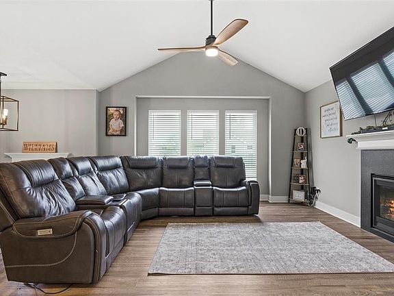 Welcome to this contemporary gem, just 1 year young! Featuring 4 bedrooms and 3 baths, this home offers both space and style.Step through the impressive tall front door into an inviting space adorned with custom metal railing inside and out. The open concept floor plan boasts high ceilings and a gas fireplace seamlessly connecting the kitchen and living area, perfect for gatherings. Living area with oversized windows allowing for plenty of natural light . The kitchen is a chef's dream, complete with a kitchen island luminated by dome industrial style pendant lighting , gas stove, 3 speed exhaust hood, large pantry, granite countertops, and a chic white subway tile backsplash.